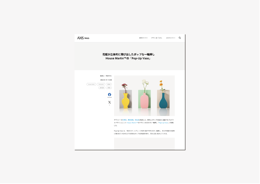 国内最大のデザインメディア「Axis」にてPop-Up Vaseを取り上げていただきました。